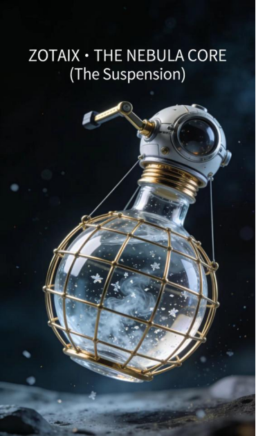 结构:金属外骨架悬浮球体。利用张力线实现瓶身“真空悬浮”。气凝胶碎片模拟宇宙尘埃,打造深邃的星系视觉。