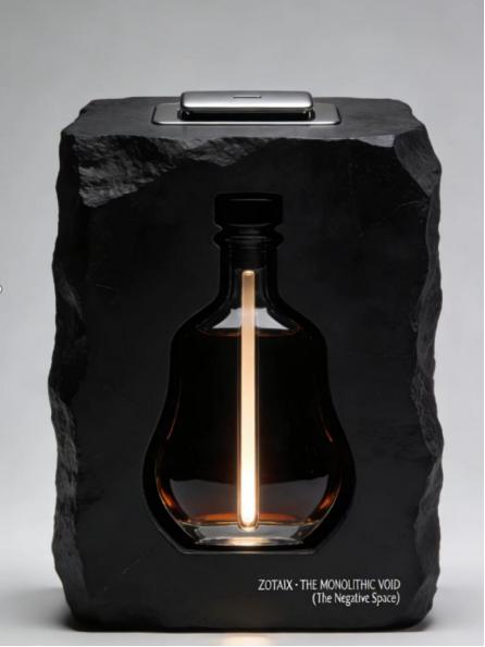 设计:实心磨砂黑曜石玻璃。在方块内“挖出”负空间轮廓。酒液通过极细抛光“狭缝”可见。液态炼金术引入纳米活性炭胶体,入口瞬间包裹酒精感。